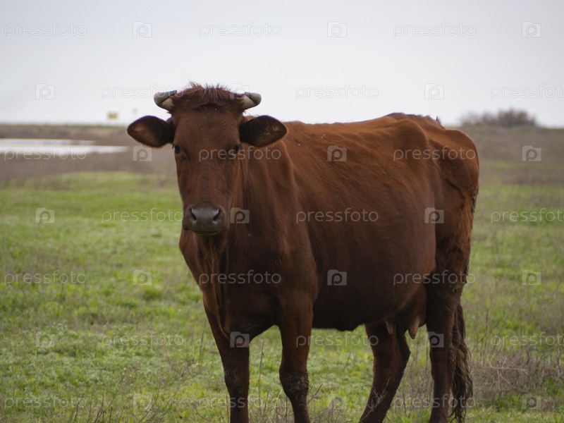 Корова на пастбище ранней весной