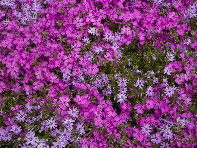Пышный ковер из розовых цветков флоксов. Весенний естественный фон. Много маленьких розовых цветов в зеленом виде сверху. Крупный план лепестков. (центр внимания)