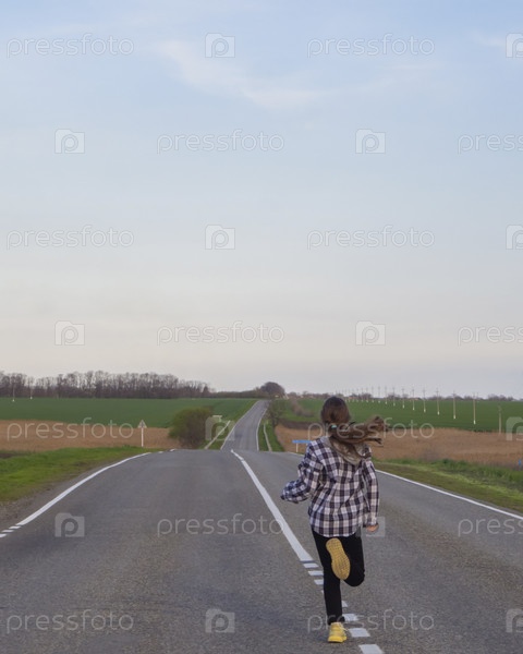 По дороге бежит молодая девушка. Девушка с длинными светлыми волосами убегает одна по пустынной дороге, уходящей вдаль среди полей. Здоровый образ жизни