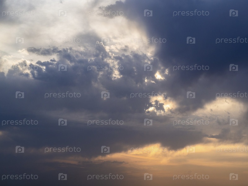 Закатное небо для фона. Солнечные лучи в разноцветных облаках