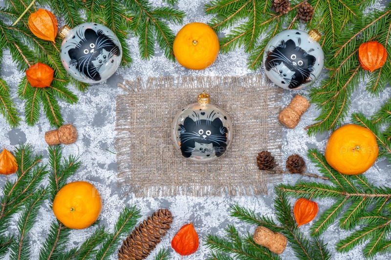 Новогоднее украшение, ветки елки и игрушки. Макеты Рождественских открыток