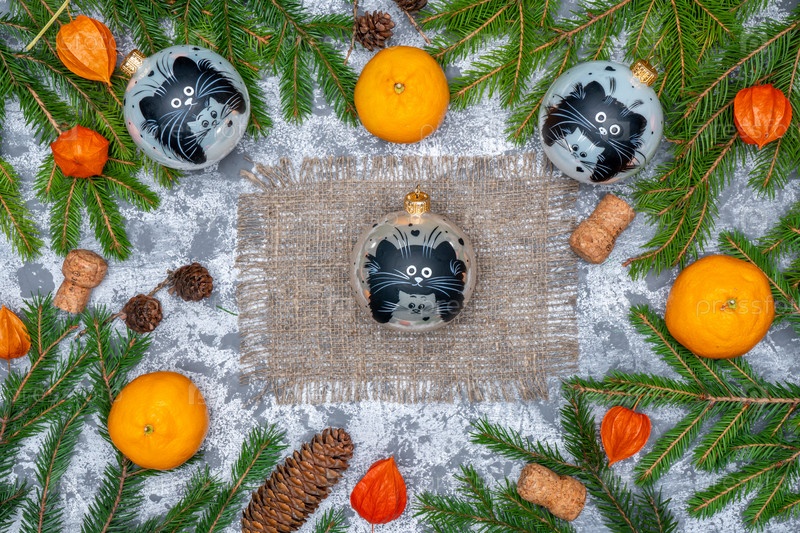 Новогоднее украшение, ветки елки и игрушки. Макеты Рождественских открыток
