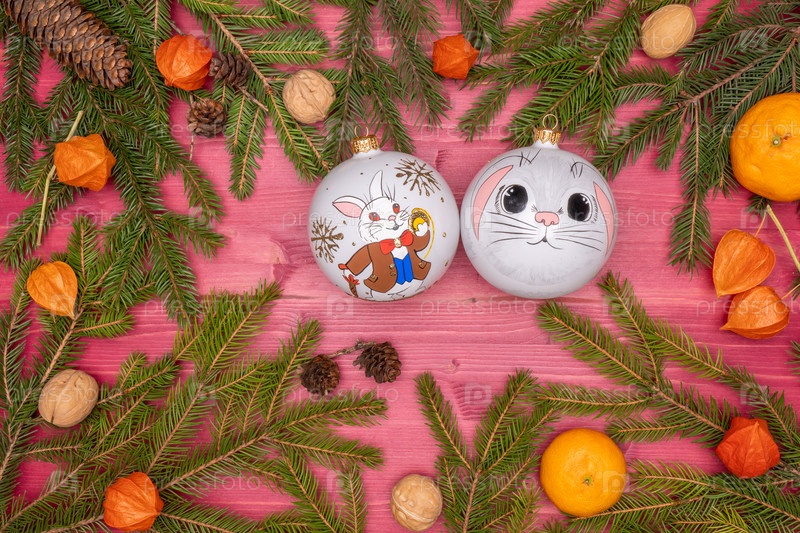 Новогоднее украшение, ветки елки и игрушки. Макеты Рождественских открыток