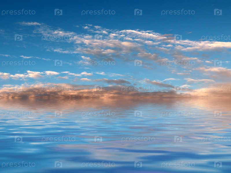Облака в небе, ярко освещенные солнцем и спокойная гладь океана