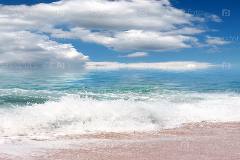 Облака в небе, ярко освещенные солнцем и спокойная гладь океана