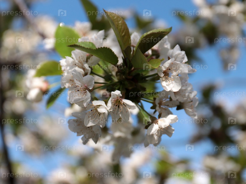 Прекрасные нежные светло-розовые цветы на ветвях яблони и облачном небе
