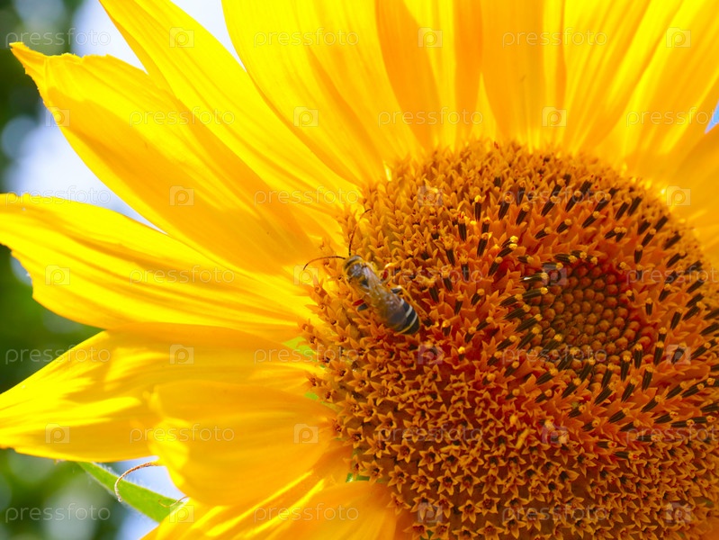 Трудолюбивая пчела собирает нектар с большого свежего подсолнуха