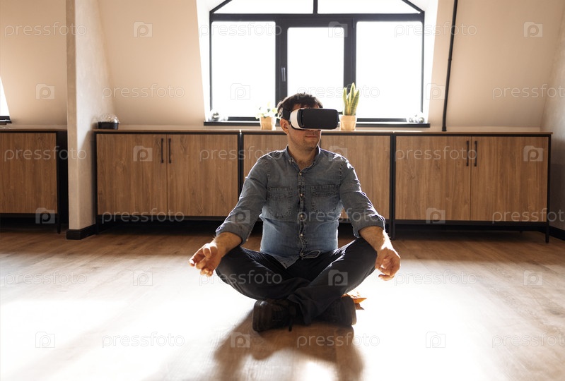 Мужчина с гарнитурой виртуальной реальности, дома на полу