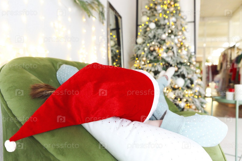 Маленькая девочка в красной шляпе Санты отдыхает на диване во время рождественских каникул дома