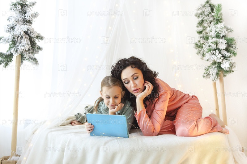 Семейное рождественское утро. Красивая семейная мать и маленькая дочь в пижаме вместе смотрят фильм или мультфильм на современном цифровом планшете