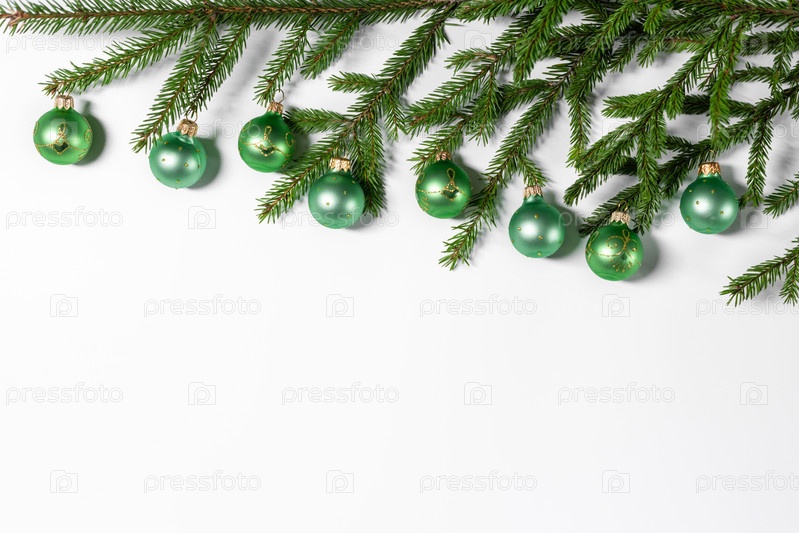 Рождественская граница из натуральных еловых веток и зеленых шаров на белом фоне. Плоская планировка, вид сверху, пространство для копирования. Рождественский фон