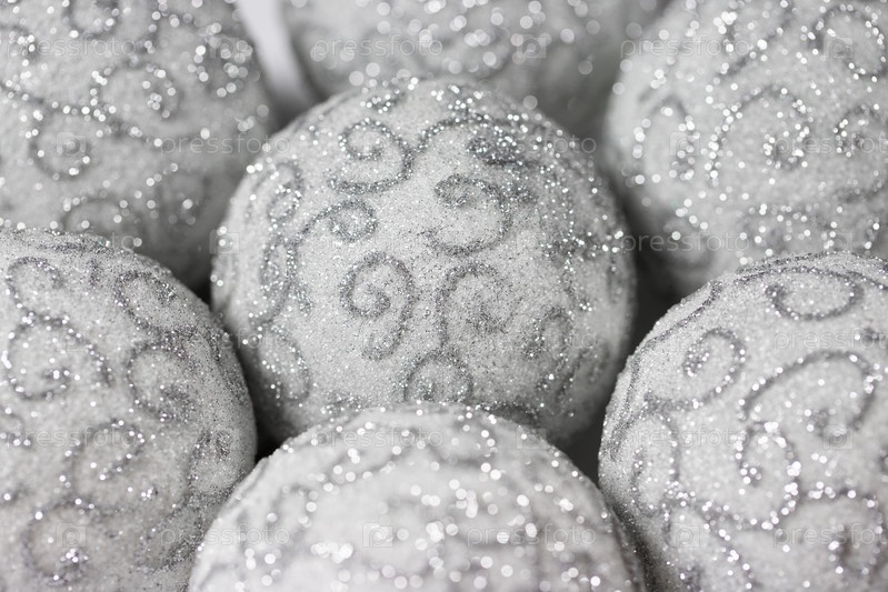 Рождественский фон. Белые елочные шары с серебряным узором крупным планом. Красивые рождественские обои