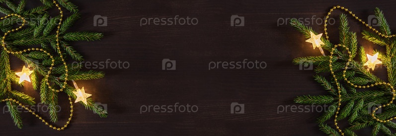 Рождественский баннер со светящейся гирляндой, еловыми ветвями и золотыми бусами на темном деревянном фоне. Скопируйте пространство, вид сверху, плоская планировка
