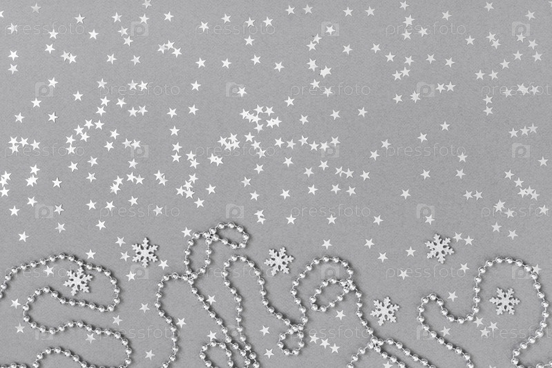 Рождественская граница с серебряными снежинками, звездами и гирляндой на сером фоне. С Новым Годом. Зимняя концепция