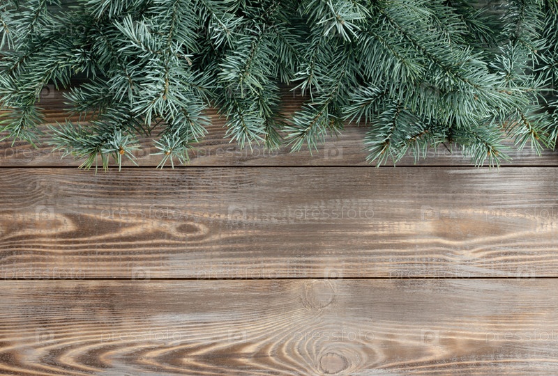 Рождественская граница с еловыми ветками на коричневом деревянном фоне. Праздничная открытка с местом для текста. Вид сверху, плоская планировка