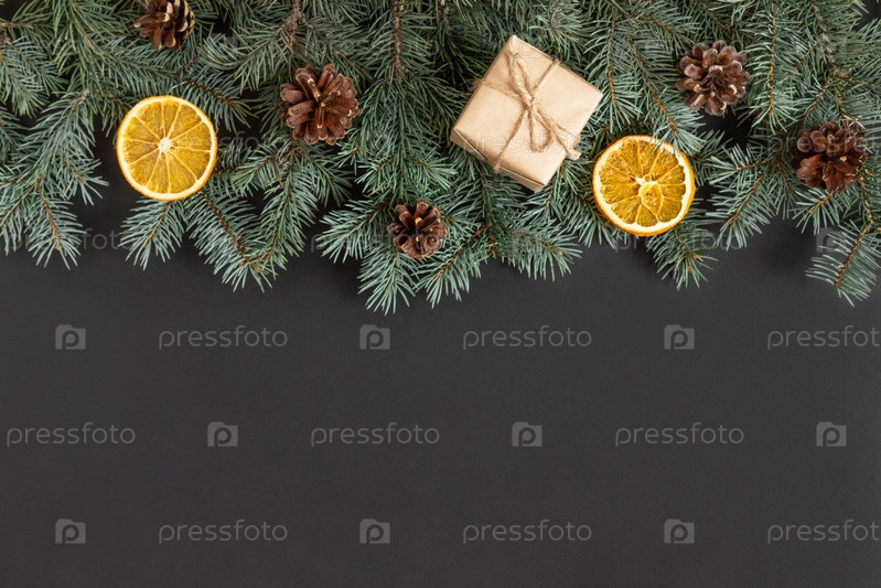 Рождественская граница с еловыми ветками, шишками и подарочными коробками на черном фоне