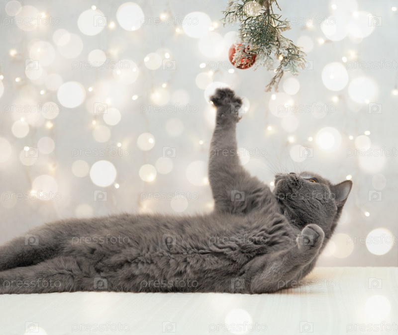 Британский кот играет с рождественскими украшениями. Милый кот играет с еловой веткой на фоне огней боке. Скопируйте пространство
