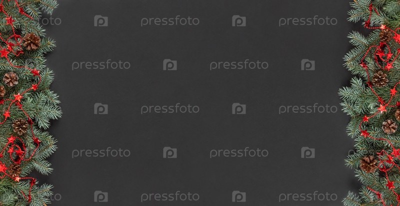 Рождественский баннер с еловыми ветками, шишками и красной гирляндой на черном фоне