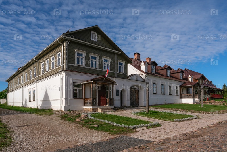 Вид на главную улицу Изборска Печорская улица со старыми традиционными купеческими усадьбами и асфальтированной дорогой в летний день, Изборск, Псковская область, Россия