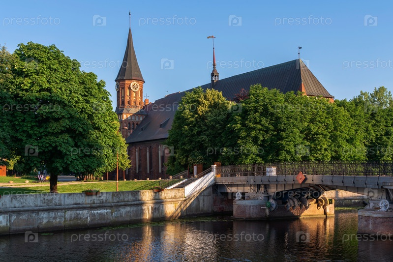 Вид на Конингбергский собор на острове Иммануила Канта на фоне Медового моста через реку Преголя в солнечный летний день, Калининград, Россия
