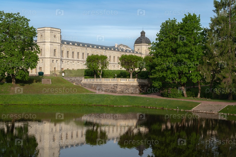 Дворцово-парковый ансамбль Гатчинского парка: Карпин пруд, Гатчинский дворец, частный дворцовый сад в солнечный летний день, Гатчина, Санкт-Петербург, Россия