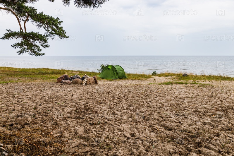 Камин и палатка для кемпинга на пляже у Балтийского моря
