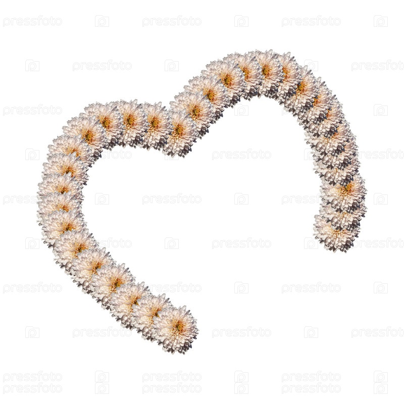 Символ сердца из цветов. Половина сердца в обрамлении белых цветов хризантемы, изолированных на белом фоне