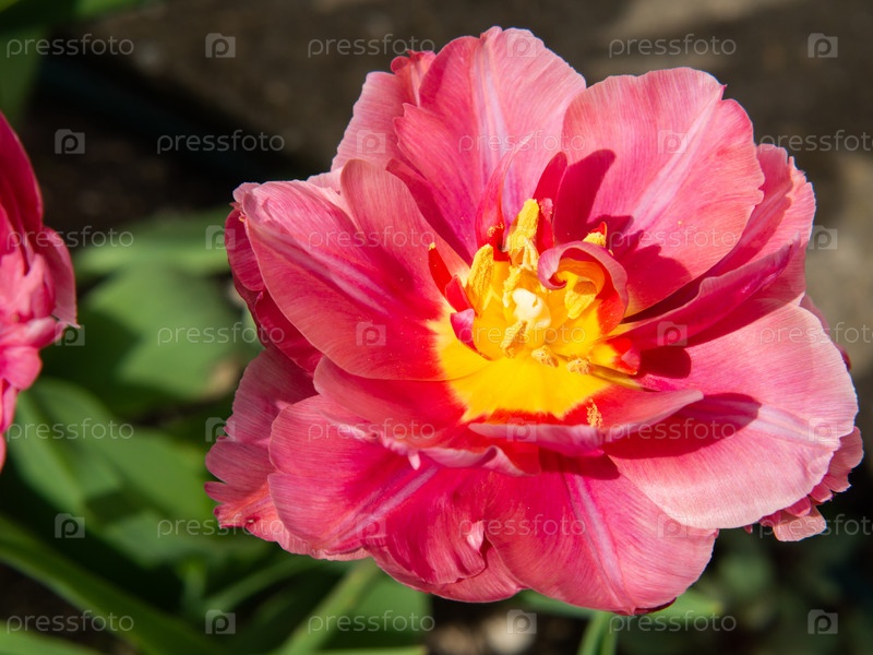 Крупный план открытого бутона тюльпана с элегантными розовыми лепестками на зеленом фоне. Красивый красно-розовый цветок тюльпана в весеннем саду