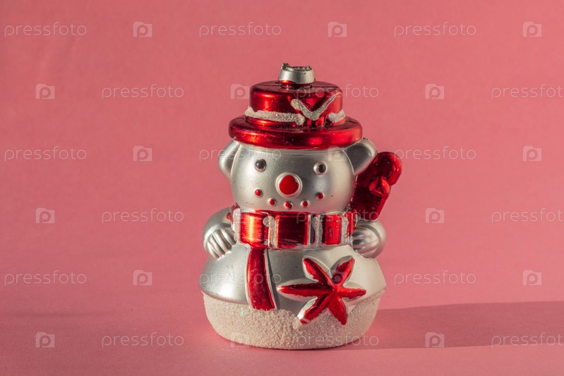 Крупный план елочной игрушки снеговика на розовом фоне