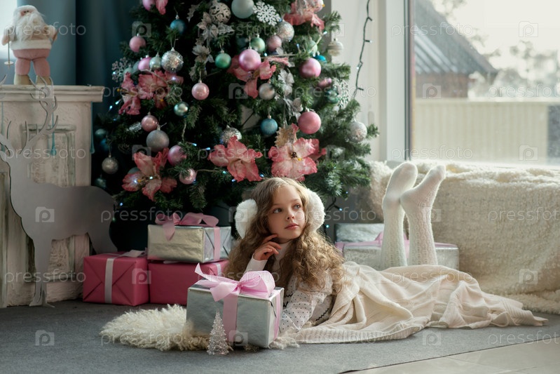 Милая маленькая девочка в зимней одежде позирует дома перед рождественской елкой с подарочной коробкой в руке