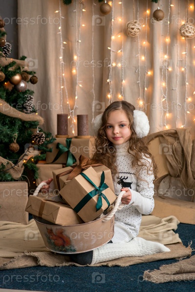 Милая маленькая девочка в зимней одежде позирует дома перед рождественской елкой с подарочной коробкой в руке