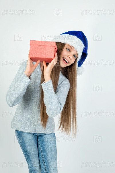 Милая маленькая девочка в зимней одежде позирует на светлом фоне с подарочной коробкой в руке