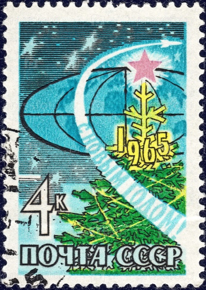СССР-около 1965 г.: почтовая марка, напечатанная в СССР, с изображением и надписью "С Новым годом!", из серии "Новый год"