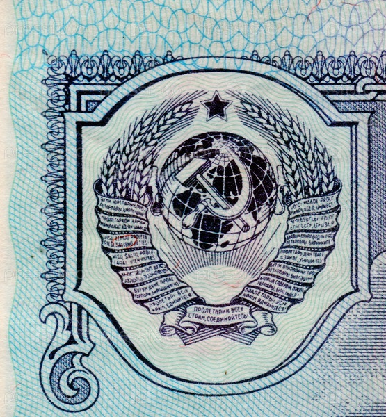 Фрагмент советской 5-рублевой бумажной купюры 1961 года с изображением герба СССР. Лицевая сторона