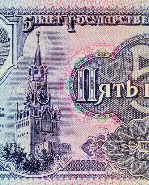 Фрагмент 5-рублевой бумажной купюры (1961 г.) СССР с изображением Спасской башни Московского Кремля, гербом СССР, номиналом