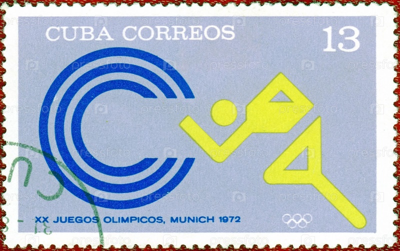Куба-около 1972 года: почтовая марка с изображением легкой атлетики и надписью XX Летние Олимпийские Игры, Мюнхен, 1972 год из серии Летние Олимпийские Игры