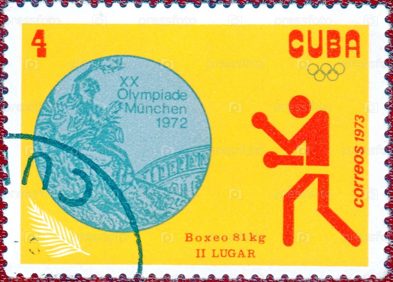 Куба-около 1973: почтовая марка с изображением боксера и олимпийской медалью, надпись 'Бокс, 81 кг' из серии 'XX летние Олимпийские игры, Мюнхен, 1972 год'