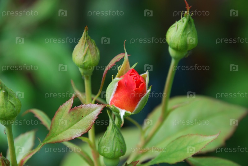 Бутон красной розы на кусте. На розовом кусте выросло несколько цветочных бутонов, большинство из них еще закрыты. Один бутон начал раскрываться, обнажая красный цветок внутри