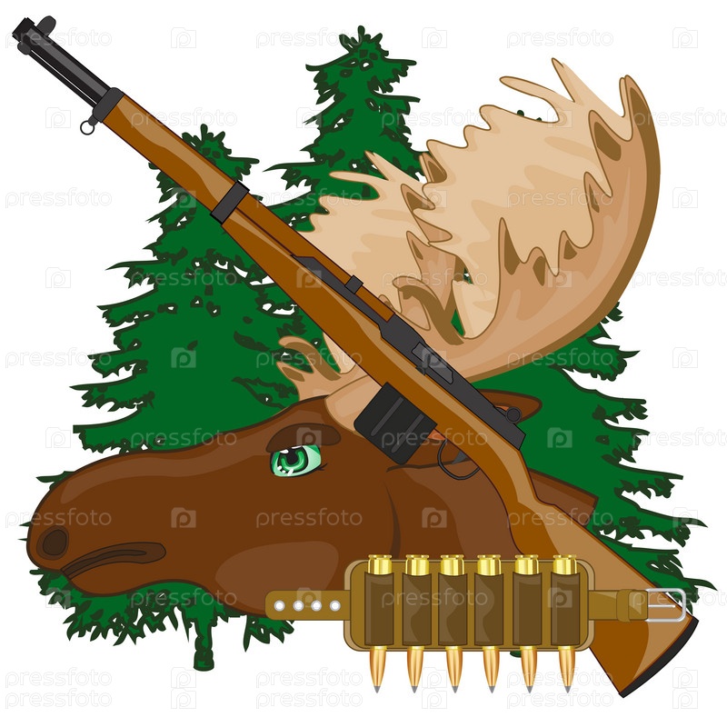 Голова лося с рогом и оружием на фоне дерева