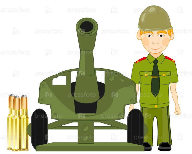 Артеллирист рядом с инструментами на белом фоне изолирован