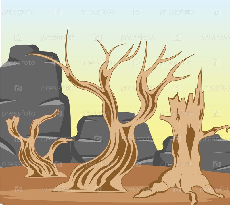 Векторная иллюстрация к пустыням с сухим деревом и камнем