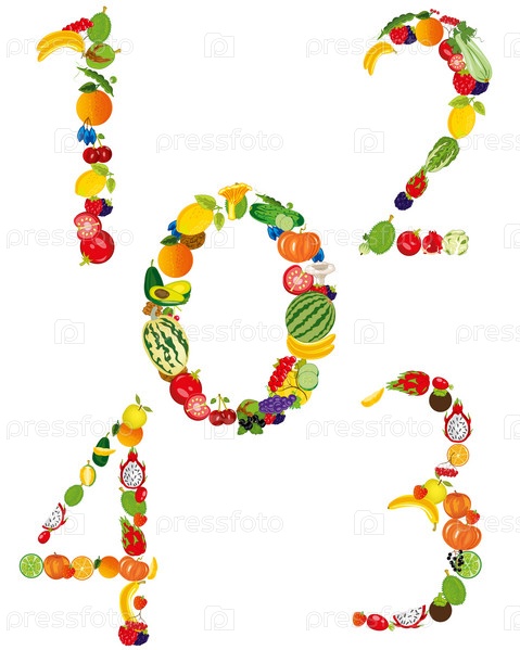 Фрукты и овощи числа на белом фоне изолированы