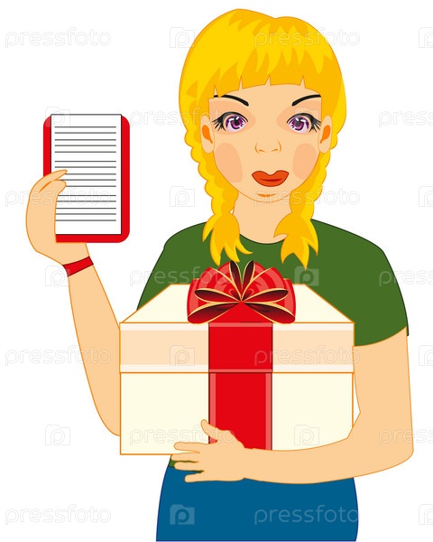 Женщина-курьер с подарком на белом фоне изолирована