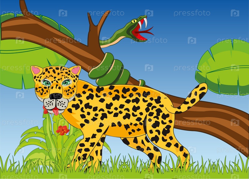 Векторная иллюстрация дикой природы леопарда и змеи на фоне зеленых джунглей