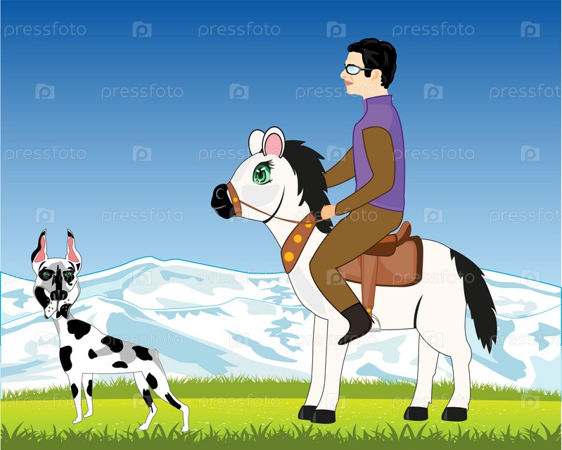 Человек идет на лошади на поляне и собаке