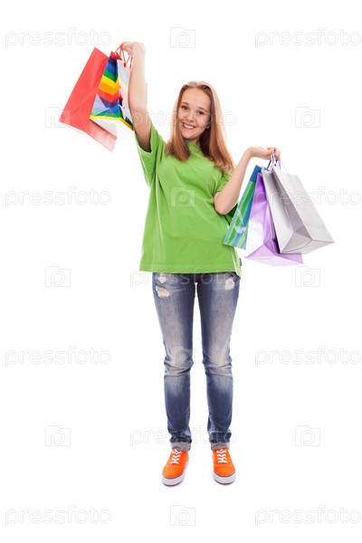 Счастливый клиент. Счастливая привлекательная девушка-подросток, стоящая с сумками для покупок на белом фоне