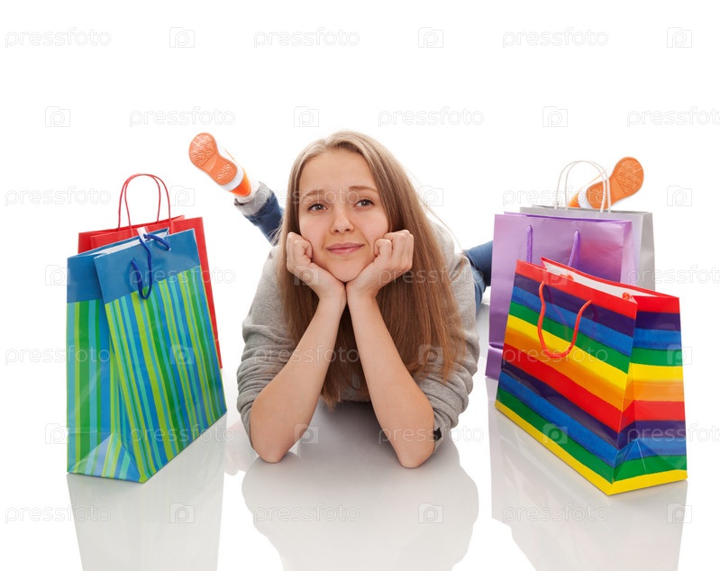 Счастливый клиент. Счастливая привлекательная девочка-подросток лежит с сумками для покупок на белом фоне