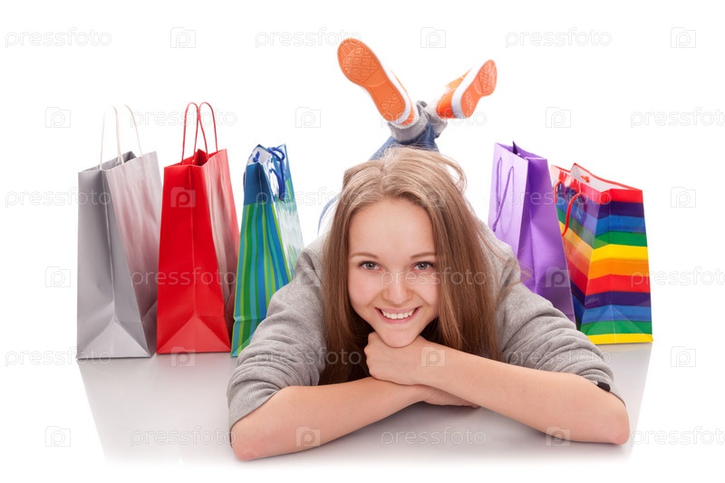 Счастливый клиент. Счастливая привлекательная девочка-подросток лежит с сумками для покупок на белом фоне