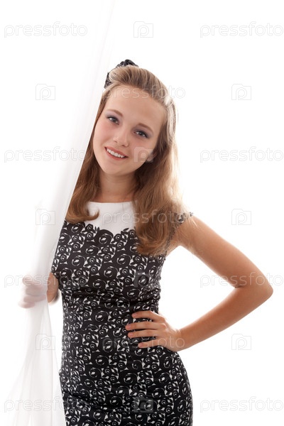 Портрет юной красавицы, молодая красивая девушка выглядывает из-за белой занавески