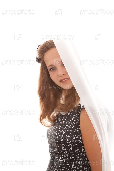 Портрет юной красавицы, молодая красивая девушка выглядывает из-за белой занавески